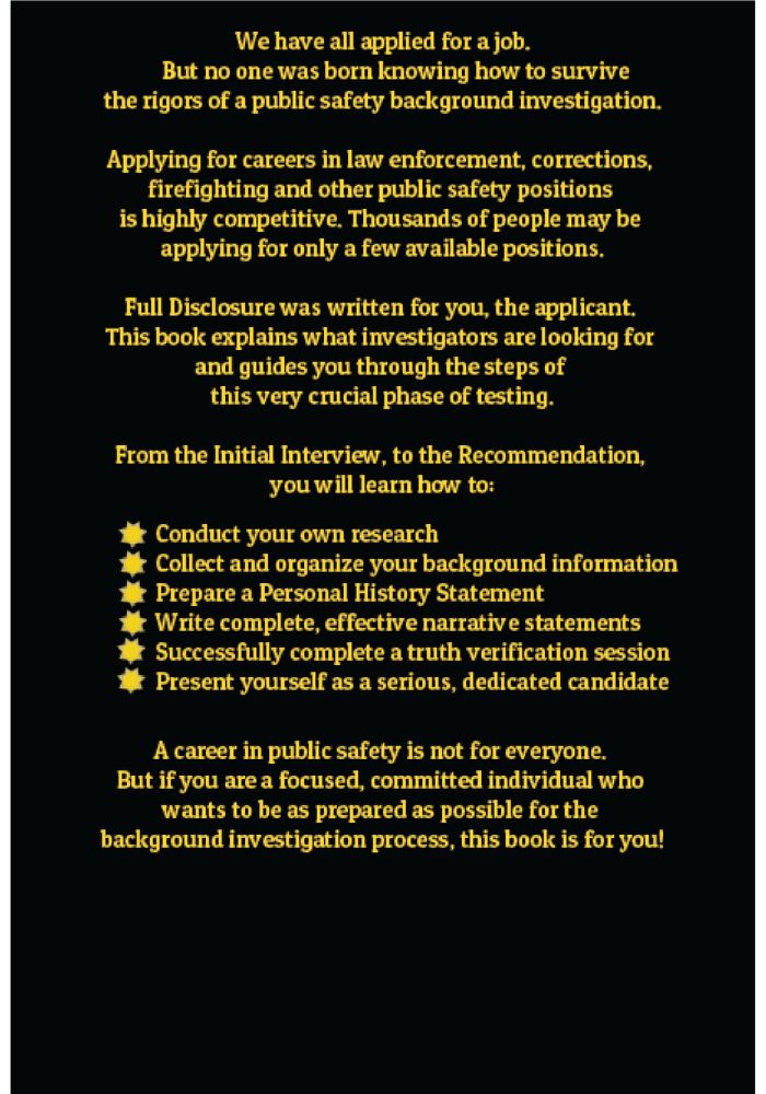 A career in public safety is not for everyone. But if you are an honest, serious, focused candidate who wants to be as prepared as possible for the background investigation process, this book is for you!